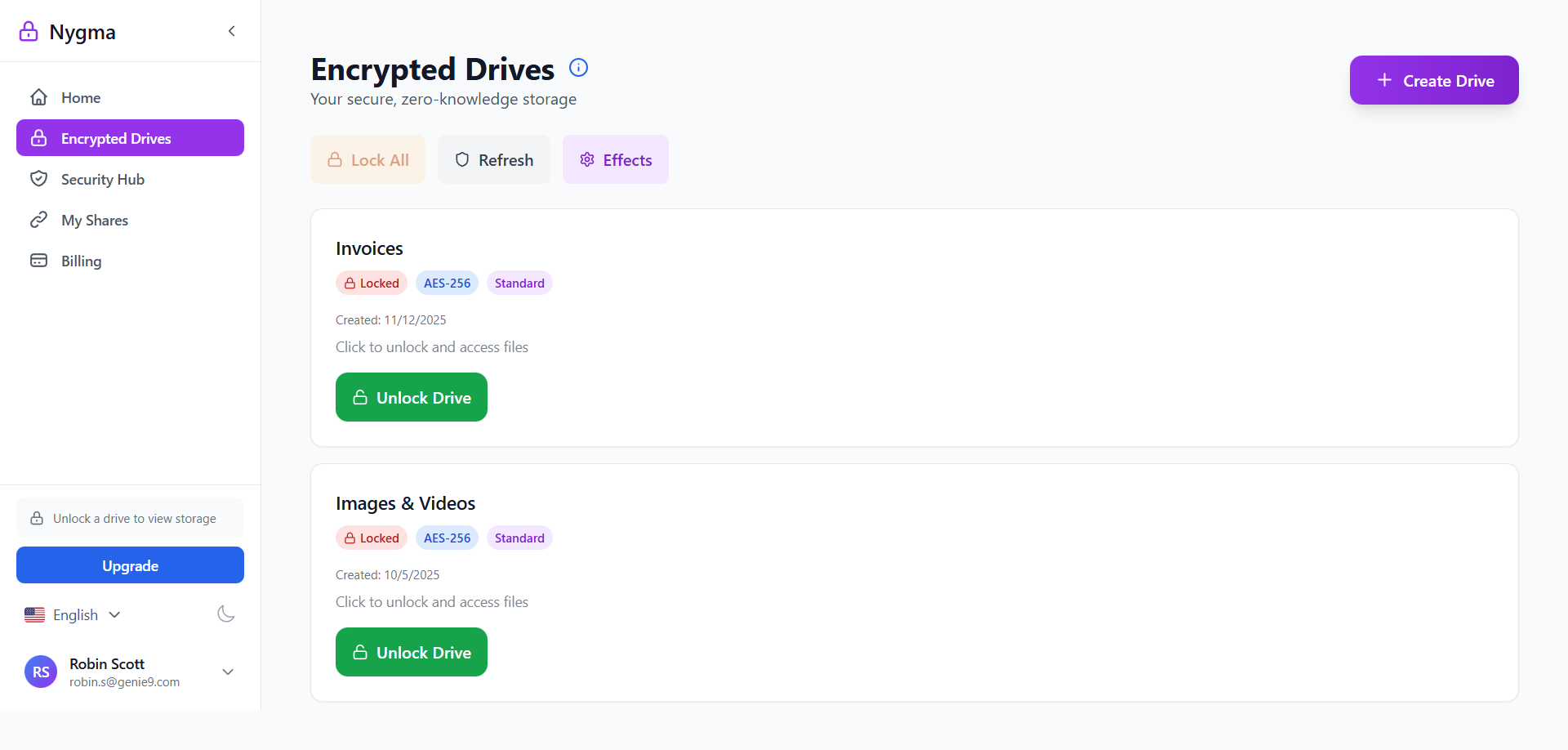Once you create an encrypted drive in your Nygma Cloud account, the next step is to start adding your data to it. Whether you want to upload important files, organize folders, or capture and store images directly from your device’s camera, Nygma makes the process simple and completely secure.